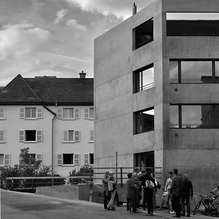 Das Betongebäude erscheint pur und ergänzt das dicht bebaute Quartier städtebaulich schlüssig.