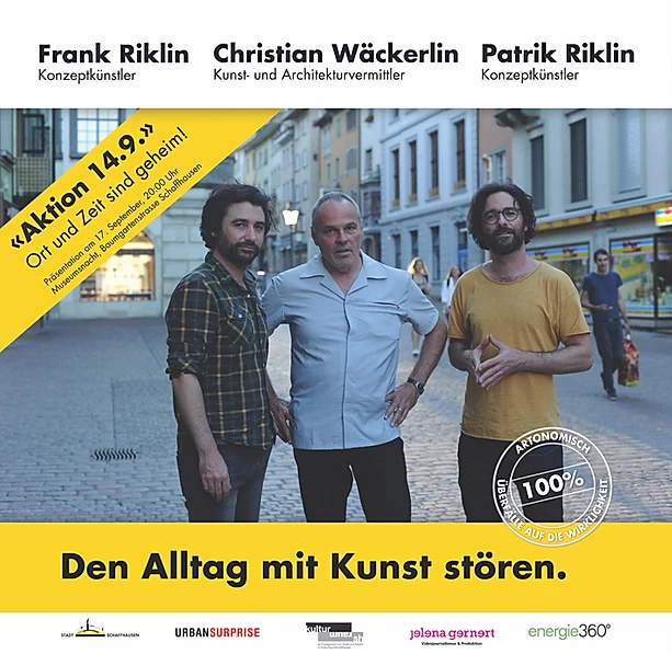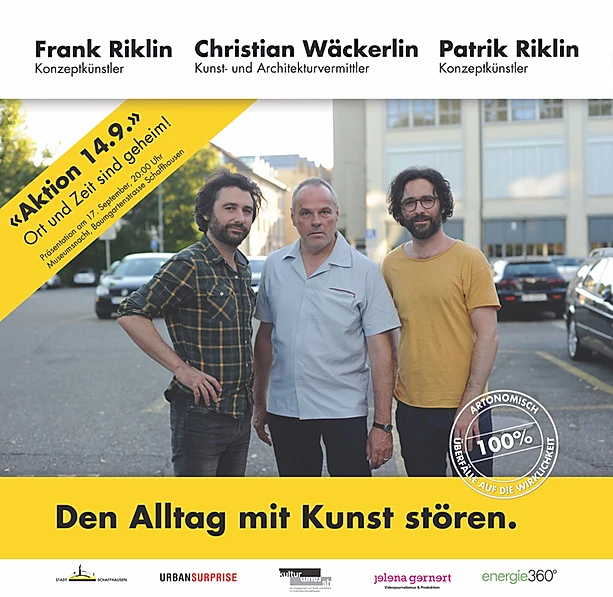 Die für Mittwoch in der Stadt Schaffhausen vorgesehene Kunstintervention «Aktion 14.9. – Überfall auf die Wirklichkeit» der Konzeptkünstler Frank und Patrik Riklin wird bis auf weiteres aufgeschoben. Grund dafür ist die Bildung der Komplizenschaft, die mehr Zeit in Anspruch nimmt als geplant, wie die beiden Künstler vom St.Galler Atelier für Sonderaufgaben gestern mitteilten. Nächste Informationen folgen, sobald die Aktion stattgefunden hat. Ort und Zeitpunkt bleiben weiterhin geheim.