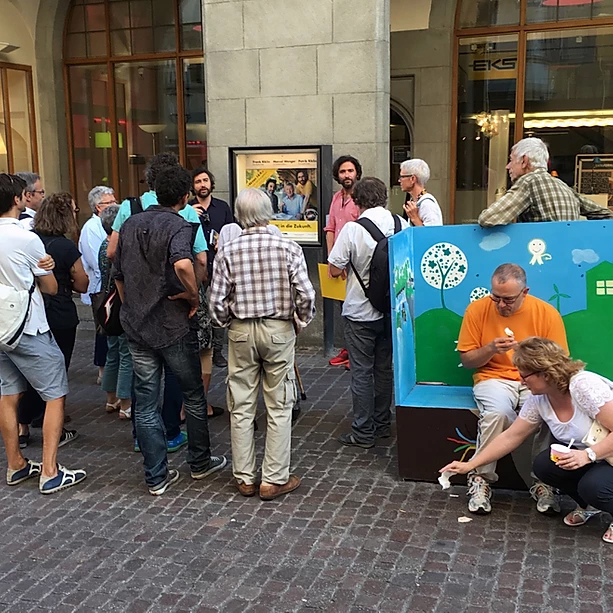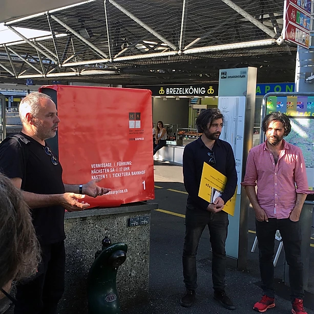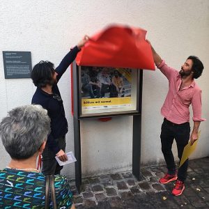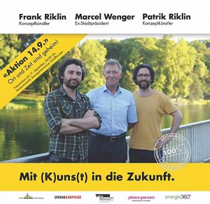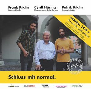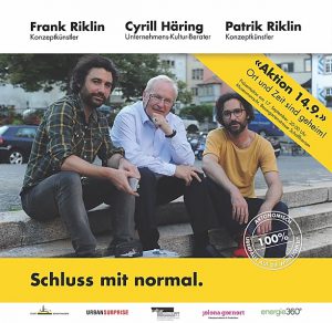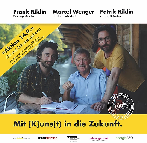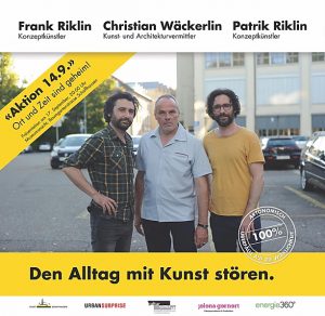 Für URBANSURPRISE, im Rahmen der neuen Kunstkästenstaffel planen die Riklins in Schaffhausen eine weitere Aktion in ihrem Sinne. Das heisst: Die «Aktion 14. 9. – Überfall auf die Wirklichkeit» ist Kunst, die dort platziert wird, wo sie niemand erwartet. Kunst, die Teil der Gesellschaft ausmachen will, denn für Kunst in Kunsträumen interessiert sich das St. Galler Duo herzlich wenig. Für Projekte, die viele Leute mit einschliessen, für Projekte, die im Prozess geboren werden, hingegen schon. Das Telefon klingelt erneut. Frank Riklin muss los, obwohl er und sein Bruder Patrik stets betonen, dass sie eigentlich gar nichts müssen.
