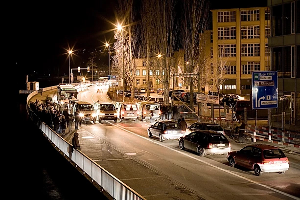 Keine Missverständnisse über ihre künstlerische Haltung und ihre Arbeitsweise gab es 2008 im Rahmen des Schaffhauser-Projekts «ausufern», ein Projekt, das von Christian Wäckerlin in der «Vebikus Kunsthalle Schaffhausen» im Zusammenhang mit der Neugestaltung des Rheinufers kuratiert wurde. Irritierend und eigenwillig war die rund 7-minütige unbewilligte Aktion trotzdem, wenn auch weniger nachhaltig als die Fliegen-Aktion. «Mit vier Lieferwagen haben wir für die Bevölkerung eine quer zur Rheinuferstrasse liegende Passage erstellt. Die Schiebetüren der Wagen liessen wir beidseitig offen. Dadurch entstand ein temporärer Korridor über die verkehrsreiche Strasse», erinnert sich Frank Riklin. Die Lieferwagen sorgten dafür, dass die Passanten die Strasse überqueren und sich gleichzeitig in den Wagen mit Wurst, Brot und Getränken verköstigen konnten, die lokale Unternehmer gespendet hatten. «Der damalige Stadtpräsident Marcel Wenger, der unverhofft Teil der Aktion wurde, habe die Strassensperre in seiner Funktion als Polizeireferent nachträglich noch bewilligt».