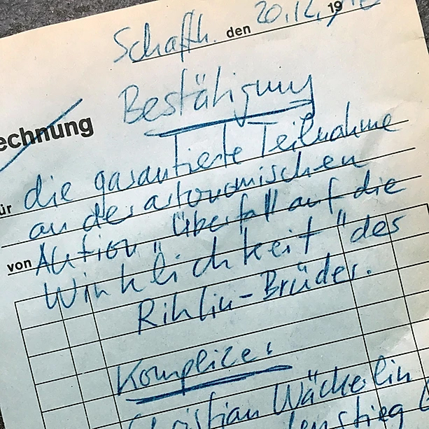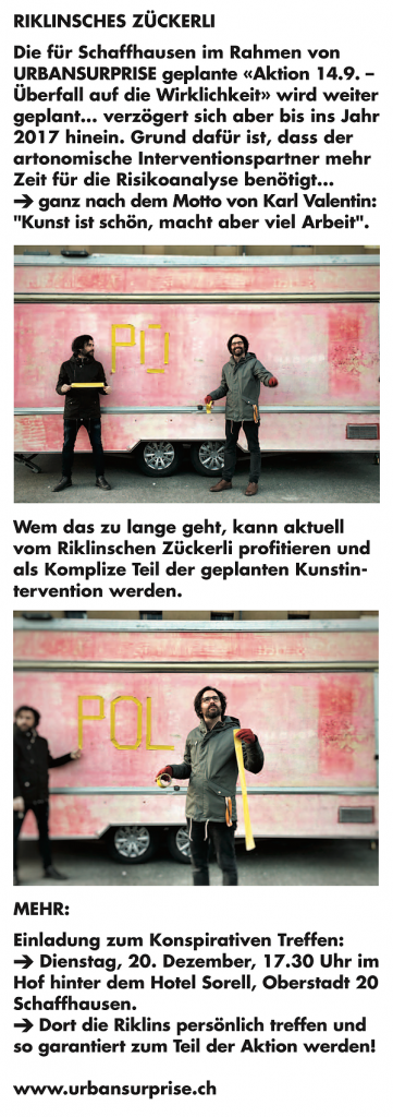 -> Zur Vorbereitung der geplanten Kunstintervention: „Überfall auf die Wirklichkeit“ findet am Dienstag, 20. Dezember, 17:30 Uhr im Hof hinter dem Hotel Sorell, Oberstadt 20, Schaffhausen das konspirative Treffen mit den Riklins statt!