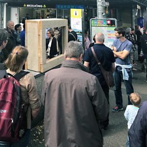 Eines stand aber von Anfang fest: Seine Werke werden nicht in den Kunstkästen drin sein. Und trotzdem sind die Kästen ein unverzichtbarer Teil dieser Arbeiten. Sie bilden ihren statischen Anker, von welchem aus sich die Werke ins Urbane hinaus erstrecken. Statt dass sie ein Werk schützend umrahmen, quasi eine Trennwand zwischen BetrachterIn und Werk aufziehen, exponieren sie – in beiderlei Sinn – die Kunst und machen sie so erfahrbar, aber natürlich auch verletzlich. Es ist das, wofür sich Weiss interessiert: der öffentliche Raum, der Mensch und seine Interaktion mit der Umgebung. Weiss’ Kunst, seine Bauwerke, stellen analoge Treffpunkte dar, die etwas auslösen und die berühren sollen. Wird es wegen der Musik beim Grill Lärmklagen geben? Kommt es zu Littering? Klaut jemand gar die Pétanque-Kugeln? Und was wird an der „schwierigen Ecke“ am Bahnhof passieren? Mitten in diesem Gewusel von ankommenden Reisenden, Wartenden und rauchenden BusfahrerInnen werden dem Kunstkasten zwei Spiegel aus Chromstahlblech verpasst, die das Durcheinander noch verdoppeln. Aber sie verwandeln den Kasten gleichzeitig auch in eine Art Boudoir, das die Menschen innenhalten lässt und den Narzissmus in der einen oder dem anderen hervorlockt. Wer wird dem eigenen Spiegelbild einen verstohlenen Blick zuwerfen, vielleicht gar noch schnell die Frisur zurechtrücken?
