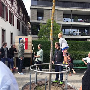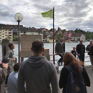 Während sich bei allen Werken in der einen oder anderen Form ein Sockel wiederfindet, unterscheiden sich drei Kästen inhaltlich etwas von den anderen; mit ihnen bricht Weiss aus der „Interaktion-Kommunikations-Ecke“ aus. Der Holzturm bei Kasten Nummer drei ist weniger erfahrbar als eher ein Sehnsuchtsort. Der Kasten an der Vordergasse unter dem Bock, für Weiss gleichzeitig der spannendste und unlogischste Standort, spricht mit dem Baumstumpf eine sehr skulpturale Sprache. Und auch die Flagge, die unter der Eisenbahnbrücke weht, fällt in erster Linie durch ihre starke Symbolik auf.