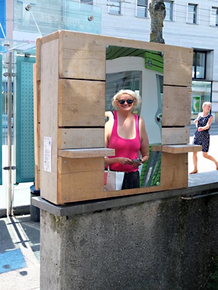 Eines stand aber von Anfang fest: Seine Werke werden nicht in den Kunstkästen drin sein. Und trotzdem sind die Kästen ein unverzichtbarer Teil dieser Arbeiten. Sie bilden ihren statischen Anker, von welchem aus sich die Werke ins Urbane hinaus erstrecken. Statt dass sie ein Werk schützend umrahmen, quasi eine Trennwand zwischen BetrachterIn und Werk aufziehen, exponieren sie – in beiderlei Sinn – die Kunst und machen sie so erfahrbar, aber natürlich auch verletzlich. Es ist das, wofür sich Weiss interessiert: der öffentliche Raum, der Mensch und seine Interaktion mit der Umgebung. Weiss’ Kunst, seine Bauwerke, stellen analoge Treffpunkte dar, die etwas auslösen und die berühren sollen. Wird es wegen der Musik beim Grill Lärmklagen geben? Kommt es zu Littering? Klaut jemand gar die Pétanque-Kugeln? Und was wird an der „schwierigen Ecke“ am Bahnhof passieren? Mitten in diesem Gewusel von ankommenden Reisenden, Wartenden und rauchenden BusfahrerInnen werden dem Kunstkasten zwei Spiegel aus Chromstahlblech verpasst, die das Durcheinander noch verdoppeln. Aber sie verwandeln den Kasten gleichzeitig auch in eine Art Boudoir, das die Menschen innenhalten lässt und den Narzissmus in der einen oder dem anderen hervorlockt. Wer wird dem eigenen Spiegelbild einen verstohlenen Blick zuwerfen, vielleicht gar noch schnell die Frisur zurechtrücken?