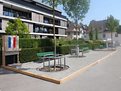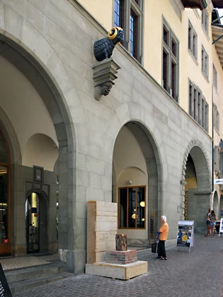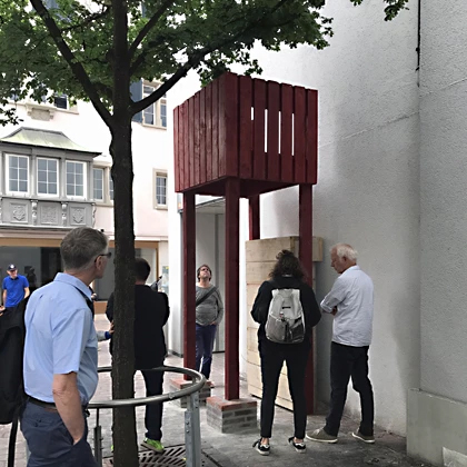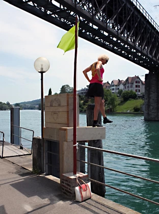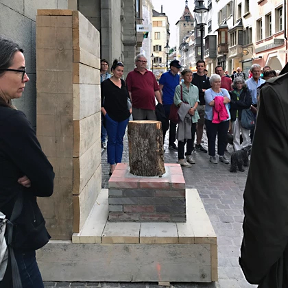 Während sich bei allen Werken in der einen oder anderen Form ein Sockel wiederfindet, unterscheiden sich drei Kästen inhaltlich etwas von den anderen; mit ihnen bricht Weiss aus der „Interaktion-Kommunikations-Ecke“ aus. Der Holzturm bei Kasten Nummer drei ist weniger erfahrbar als eher ein Sehnsuchtsort. Der Kasten an der Vordergasse unter dem Bock, für Weiss gleichzeitig der spannendste und unlogischste Standort, spricht mit dem Baumstumpf eine sehr skulpturale Sprache. Und auch die Flagge, die unter der Eisenbahnbrücke weht, fällt in erster Linie durch ihre starke Symbolik auf.