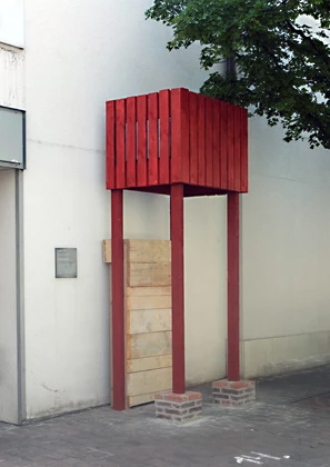 Begehen, besitzen, bespielen, bestaunen soll man die Bauten von Markus Weiss. Sie haben keinen Platz in den Kunstkästen drin – und so ist Weiss der erste Künstler in der Geschichte der Kunstkästen, der nicht in die Kästen hinein, sondern darum herum baut. Er verankert seine Arbeiten an den Kunstkästen und lässt sie in die Stadt hinauswachsen. Hier steht ein Turm, dort ein Baumstumpf; seine Bauten sind teilweise brachial und von einer pragmatischen Ästhetik. Alle setzen sie sich auseinander mit den kulturellen, sozialen und architektonischen Dimensionen eines Ortes und schaffen in gewisser Weise neue Räume – tatsächliche, aber auch vorgestellte. Einmal entsteht ein Ort zum Grillieren, einmal ein ganzer Pétanque-Platz und einmal verdoppelt ein Spiegel den vorhandenen Raum und sein Geschehen. Weiss’ Arbeit bedeutet stets Interaktion mit dem öffentlichen Raum, sie soll die Schwellenangst vor der Kunst nehmen – denn die Kunst ist bei ihm nicht immer im klassischen Sinn als solche erkennbar.