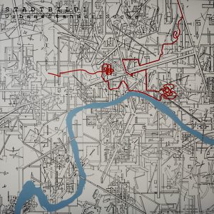 Das zeigt sich sogleich im ersten Bild. Wir sehen eine, in eine Stadtkarte umfunktionierte, Zeichnung von Architekt Daniel Libeskind, die Urs Kick mit einer roten Linie versehen hat. Sie scheint einen Weg zu verfolgen, verliert sich dann aber im Nichts. Sie symbolisiert Kicks erfolglose Suche nach einem Standort, von wo aus sich eine Stadt überblicken und (be)greifen lässt.