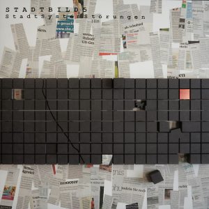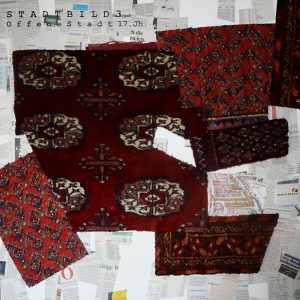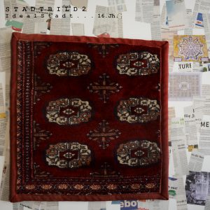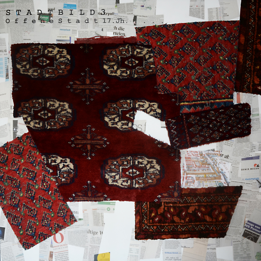 Auf einer Zeitungscollage klebt ein Stück Teppich mit einem klar umrissenen Rand, der an eine Mauer erinnert. Im 16. Jahrhundert war es das Ziel vieler bekannter Architekten, „Idealstädte“ zu kreieren. Die schützenden Stadtmauern hatten dabei eine wichtige Funktion: Sie trennten klar zwischen Drin und Draussen, zwischen Dazugehören oder nicht. Dank diesem Mechanismus sollten die idealen Städte optimal effizient funktionieren, sie waren überschau- und kontrollierbar. Die Mauer als Machtinstrument, das Ordnung schafft. Kick wählt hier einen Teppich als Material, da StadtplanerInnen häufig vom „Gewebe einer Stadt“ sprechen; ein Begriff, der ihm zu zweidimensional ist. Mit seinen Knoten gibt ein Teppich die Dreidimensionalität und das punktuelle Wachsen einer Stadt viel besser wieder.