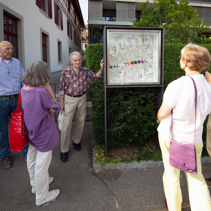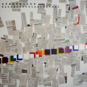 Doch der Traum – die perfekte Stadt – wird immer ein Traum bleiben. Der Philosoph Heraklit hat gesagt, man könne niemals zwei Mal in denselben Fluss steigen. Und so verhält es sich auch mit der Stadt. Jede Stadt verändert sich ständig, an jeder Ecke wird gebastelt, erweitert. Menschen ziehen um, Häuser werden renoviert, hier entsteht ein Laden, da muss ein anderer schliessen. Kick meint, dass gerade diese Unstetigkeit es erschwere, Zukunftsvisionen für Städte zu entwickeln. Den Wandel gibt der Künstler im vierten Kunstkasten wieder mit verschiedenen Farbflächen, die scheinbar über die Zeitungscollage tanzen.
