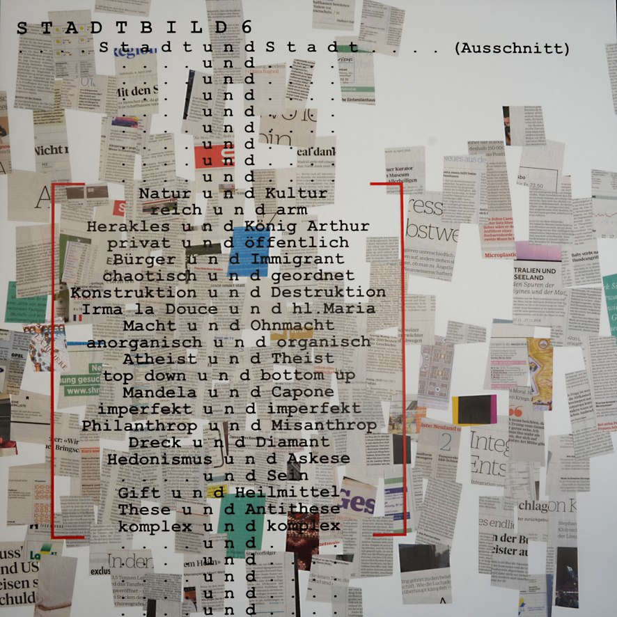 Im letzten Kunstkasten sehen wir eine Liste von gegensätzlichen Wortpaaren, verbunden mit einem „und“: „Mandela und Capone“, „Gift und Heilmittel“, „privat und öffentlich“… Das Wort „und“ steht im Zentrum. Im Gegensatz zum trennenden „oder“ ist es verbindend. Hier zeigt uns Kick die Vielfalt der Stadt, ihre Fähigkeit grosszügig alles einzuschliessen. So sehr, dass sie fast an ihrer eigenen Komplexität scheitert.