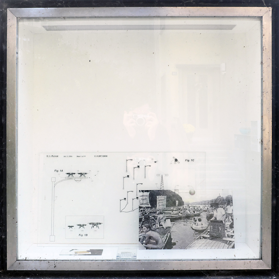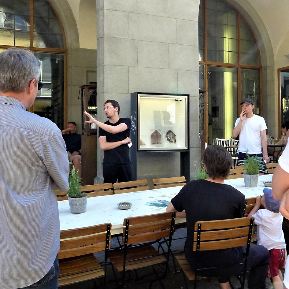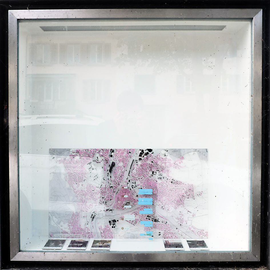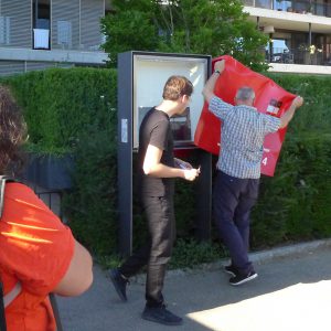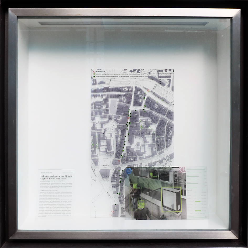 Die beiden Architekturstudenten Tamino Kuny (1993, Luzern) und Julian Wäckerlin (1990, Schaffhausen) interessiert, wie globale Technologieunternehmen die Kontrolle über die Stadt übernehmen und so den Alltag im urbanen Raum verändern. In den Kunstkästen stellen sie ortsspezifische Schaffhauser Realitäten in einen Bezug zu global operierenden Apps, wie wir sie alle in unseren Smartphones herumtragen und tagtäglich nutzen. Kuny und Wäckerlin kreuzen, paaren, mischen, überlagern effektive und virtuelle Realität und erzeugen Fiktion. Die Kunstkästen werden zu eigentlichen Hybriden: