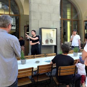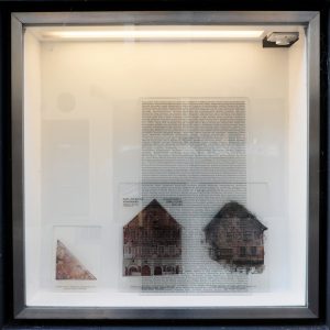 Eine weitere Glasscheibe mit Text zeigt eine Liste von Hashtags, die das „Haus zum Ritter“ mit ähnlichen Bildern oder Themen verknüpfen. „Durch die Intensität dieser Fiktionalisierung, durch die krasse Gegenüberstellung von lokal-global, wird eine Diskussion angeregt“, ist Julian Wäckerlin überzeugt.