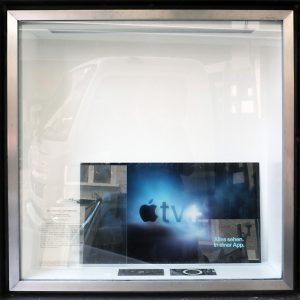Im Kunstkasten an der Goldsteinstrasse finden wir auf einer ersten Glasscheibe die ortsspezifische Realität, eine Abbildung des „Grossen Gottes von Schaffhausen“, eines kolossales Kruzifix aus Holz, das bis 1529 im Kloster Allerheiligen Ziel vieler Pilger war und in der Reformation verbrannt wurde. Diese Reliquie wird in einem gewagten Sprung gekreuzt mit dem blutjungen Werbespot für apple TV+, den Kuny und Wäckerlin mit einem dramatischen, barocken Himmel hinterlegt vorfinden und damit die fast schon sakrale Ausstrahlung des Applekonzerns betonen. Dazu gibt es als Text „Alles sehen. In einer App“. Nicht mehr Gott ist der alles Sehende, alles Wissende, sondern wir alle mittels heutiger Technologien. „Diese Signete und die Bildersprache werden die Aufmerksamkeit anziehen und auch irritieren“, sind sie sich bewusst.